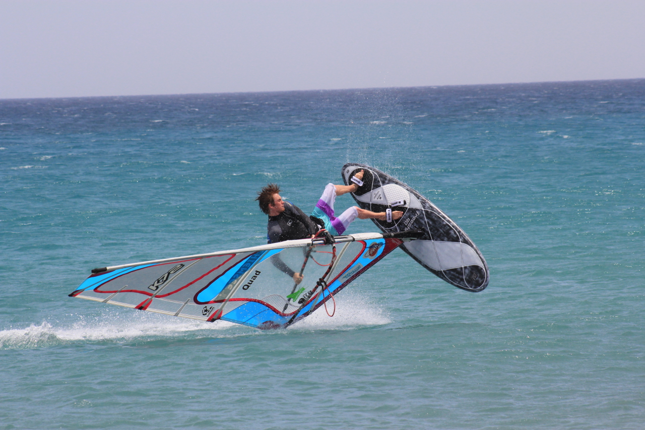 In the double I got pretty unlucky again, I just couldn’t find the gusts on one tack and despite pumping across the whole heat area I couldn’t get planning enough to do anything better then a sliding upwind 360, the worst flaka attempt of my life because I physically didn’t have enough speed to pop the board out the water. Anyway that heat counted for some reason and I lost out bad because I was in that point of the ladder where you lose once and you drop 4 places! Gutted! From then on the wind got worse and worse but the double was completed, just, and Steven won with some impressive moves in really no wind at all. I think EFPT Head Judge Tom Hartmann did a great job at getting the double finished and really had some hard decisions to make when it came down to the final heats, in the end everyone was impressed we finished it and for sure the judges didn’t have an easy time either, there were some really really close heats!